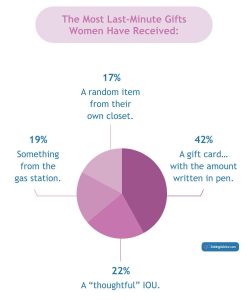 Nearly a quarter (22%) wrote out an IOU — for a delayed gift, somewhere down the line, who knows when. The second most unforgivable item was something from the gas station (19%) — like, what, charcoal briquettes for the BBQ? Because nothing classy is ever for sale in a gas station. And, worst of all, giving their partner a random item FROM THEIR OWN CLOSET! (17%) as if they wouldn’t already know it was theirs!